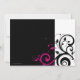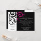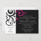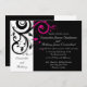 Bold and striking modern contemporary black wedding invitations with white and magenta accents, with delicate swirl scroll leaf background.