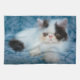 This cute Getty Images photo features a fluffy black and white kitten sitting on blue blanket.