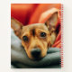 This cute Getty Images photo features a Miniature Pinscher lying on the sofa.
