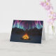 In a snow-covered valley on a frosty night in the dead of winter a bonfire leaps up to mirror the northern lights filling the sky above the distant mountains.