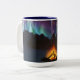 In a snow-covered valley on a frosty night in the dead of winter a bonfire leaps up to mirror the northern lights filling the sky above the distant mountains.