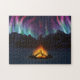 In a snow-covered valley on a frosty night in the dead of winter a bonfire leaps up to mirror the northern lights filling the sky above the distant mountains.