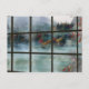 A chilly autumn landscape viewed through a frosted window early one morning. Fir and pine trees with ice whitening their needles, maples in shades of red, orange, and yellow, frost-whitened grass seen through the fog rising from a hidden stream. Flanking the window on either side are red-and-green rose leaves.