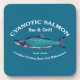 A blue-toned Sockeye Salmon with text reading "Cyanotic Salmon Bar & Grill Kenai, Alaska" and "Combat Fishing Rest And Relaxation. Fishing for salmon is very popular, too popular in Alaska. Imagine hundred of anglers, just about shoulder to shoulder, lining both banks of a stream trying to avoiding crossing lines with everyone else in hopes of landing a big salmon. That's combat fishing. After a day of that take some R&R at the mythical Cyanotic Salmon in Kenai. Fishing tales told there...some true.