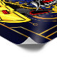A futuristic samurai helmet, inspired by the oni demon, is showcased in a vibrant blue and gold colour scheme. The mask features intricate metallic details, sharp fangs, and glowing red eyes. The background is a dark blue canvas with intricate geometric patterns, adding to the overall cyberpunk aesthetic.