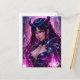 Send greetings from a futuristic, neon-drenched metropolis with this stunning cyberpunk postcard! The electrifying artwork features a powerful and alluring demon girl with striking purple eyes and formidable horns, set against a dazzling cyberpunk cityscape illuminated by neon pink and purple lights. Clad in intricate cybernetic armour that pulses with cosmic energy, she wields orbs of pure purple magic. This postcard is a perfect fusion of science fiction and dark fantasy, ideal for Halloween greetings or for any fan of cyberpunk aesthetics, powerful female characters, and futuristic anime art.
