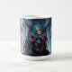 This intense image portrays a menacing demon samurai, adorned with a futuristic, dark outfit and a mask with glowing red eyes and horns. Set in a neon-lit, urban environment inspired by cyberpunk aesthetics, the character stands amidst numerous illuminated signs and symbols, suggesting a bustling, high-tech cityscape.