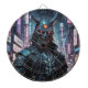 This intense image portrays a menacing demon samurai, adorned with a futuristic, dark outfit and a mask with glowing red eyes and horns. Set in a neon-lit, urban environment inspired by cyberpunk aesthetics, the character stands amidst numerous illuminated signs and symbols, suggesting a bustling, high-tech cityscape.
