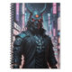 This intense image portrays a menacing demon samurai, adorned with a futuristic, dark outfit and a mask with glowing red eyes and horns. Set in a neon-lit, urban environment inspired by cyberpunk aesthetics, the character stands amidst numerous illuminated signs and symbols, suggesting a bustling, high-tech cityscape.