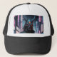 This intense image portrays a menacing demon samurai, adorned with a futuristic, dark outfit and a mask with glowing red eyes and horns. Set in a neon-lit, urban environment inspired by cyberpunk aesthetics, the character stands amidst numerous illuminated signs and symbols, suggesting a bustling, high-tech cityscape.