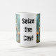 A morphing mug that unveils a cyberpunk girl on a mushroom as it heats up, with 'Seize the Day' in bold, electric lettering. It's a daily dose of futuristic motivation!