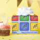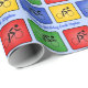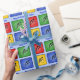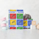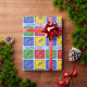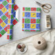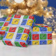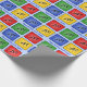 This wrapping paper is ready for personalisation with your custom text and name (in blue). The design has a tiled pattern of four colourful icons (red, yellow, green and blue) with the silhouette of a cyclist.