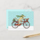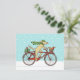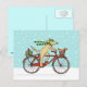 Cute cartoon dog wearing a green striped winter hat and long scarf and pedaling a red bicycle. Cheerful red squirrel is riding in the bike basket. These two are on their way to deliver Christmas presents to friends. This whimsical animal art holiday postcard is perfect for personal or business mailings. Visit Jenn's Doodle World for more fun animal design cards and gifts.