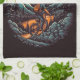 Cycling Life, retro painting in orange and blue of a cyclist riding through the mountains and forest with the sun in the background