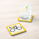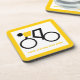 Cyclist riding his bicycle custom beverage coaster that showcases a minimalist icon of a black cycling silhouette wearing yellow top and your text on white background with yellow border. This cool design is a template and it is completely customizable.
