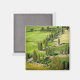 Square souvenir photo magnet of a zigzag winding, cypress tree lined road through the green fields in Monticchiello, Tuscany in Italy.