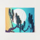 Tapestry in a Japanese inspired silhouette of a cypress tree, framing a full moon, against an aqua and coral orange sky