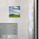 Souvenir fridge magnet with the text: 'Toscana' and a group of cypress trees in a landscape with green hills and yellow flowers under beautiful white clouds near Torrenieri in the Val d'Orcia (Orcia valley) in Tuscany, Italy.
