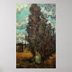 Cypresses and Two Women by Vincent van Gogh is a vintage fine art post impressionism landscape nature painting. A symbol of friendship, best friends taking a walk down country lane in the south of France. A view of cypress trees with two female figures and white fluffy clouds in a blue summer sky. A farmhouse and fields are in the distance.