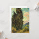 Cypresses by Vincent van Gogh is a vintage fine art post impressionism landscape nature painting. Cypress trees in a meadow, white fluffy clouds in the blue summer sky and a sliver of a crescent moon.