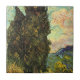 Cypresses by Vincent van Gogh is a vintage fine art post impressionism landscape nature painting. Cypress trees in a meadow, white fluffy clouds in the blue summer sky and a sliver of a crescent moon.