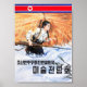 Across the top, the North Korean flag. Below, a young woman in braids fords a turbulent river. She carries a large bale of grain on her back and a rifle in her right hand.