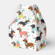 Cute birthday party dachshund dogs with black, tan and dapple coats dressed in cute birthday outfits with balloons, cake and confetti pattern.