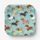 Cute birthday party dachshund dogs with black, tan and dapple coats dressed in cute birthday outfits with balloons, cake and confetti pattern.