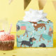 Cute birthday party dachshund dogs with black, tan and dapple coats dressed in cute birthday outfits with balloons, cake and confetti pattern.