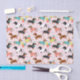 Cute birthday party dachshund dogs with black, tan and dapple coats dressed in cute birthday outfits with balloons, cake and confetti pattern.