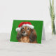 Red long haired dachshund wears a Santa Claus hat and wishes a Merry Christmas dog lovers Christmas holiday greeting card