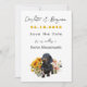 Save the date wedding announcement template with Dachshund dog design. Customise for your wedding event using five lines of text in script and printed fonts in black and sunflower yellow. First names at the top with chunky numbers for date, in yellow gold colour. A cute black dog stands among sunflowers and wildflowers in the design at the bottom. Perfect for a spring or summer wedding. Easily change the text colour in the design tool, or ask me for help.