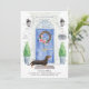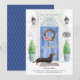 Announce your new address with our stylish announcement featuring a Dachshund, blue front door, welcome mat, slate sign, topiaries and a floral wreath set on a grey brick background.