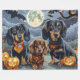 Unleash the spooky spirit with this eerie Halloween design featuring a pack of dogs under a dark, moonlit sky, surrounded by flying bats and glowing pumpkins. Perfect for those who love a touch of frightful fun with their furry friends!