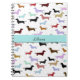 Cute notebook that you can customise with your name. It features colourful little dachshund dogs on a white background. An aqua stripe runs through the centre waiting for your name.