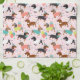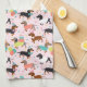 Cute birthday party dachshund dogs with black, tan and dapple coats dressed in cute birthday outfits with balloons, cake and confetti pattern.