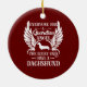 Everyone has a guardian angel the lucky ones have a dachshund typography word art display in mixed white script and uppercase font lettering with two large white angel wings and scroll text embellishments and a white dog silhouette.