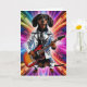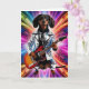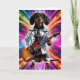A Dachshund in a shiny silver outfit is playing guitar with a psychedelic background.