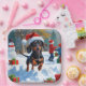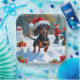 A playful Dachshund runs through the snowy winter scene, wearing a festive red Christmas hat. This charming design highlights the breed’s long body, short legs, and spirited personality while capturing the warmth and joy of the holiday season. A delightful winter moment full of festive cheer.