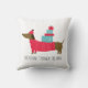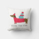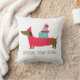 Dachshund Through The Snow Cute Christmas Dog Fun Throw Pillows features a cute whimsical Dachshund dog carrying gifts with the text "Dachshund through the snow" in modern script. Designed by Evco Holidays www.zazzle.com/store/evcoholidays