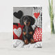 Dachshund Valentine's card. Cuddly canine set against a contemporary background in red, black and white. No flowers, just hearts and bags of cuteness.