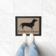 Dachshunds welcome doormat with a faux burlap printed background, black edges, and a black dachshund weenie dog silhouette.