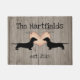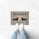 Dachshund themed door mat done in a rustic wood board look, with cute graphics of two black dachshund silhouettes against a country polka dot heart. Personalise the black text to suit your needs.