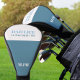 Monogrammed golf driver cover with Dad quote, stylish colour palette and simple styling. The wording reads "Dad life is the best life" in modern typography and the template is set up for you to add your initials. The design has a teal and ivory colour block with blue, teal and ivory lettering.