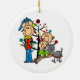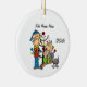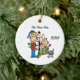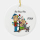 A cute, fun ceramic ornament featuring a dad, mum, toddler boy, toddler girl, and grey dog in front of the holiday tree!