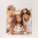 Jig saw puzzle featuring your custom photo and the text "Dad, we love you" and little white hearts.