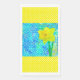 This paper guest towel flaunts a digital collage made up of several layers of paintings, textures and scans. The sunny daffodil "pops" off the blue backdrop. Cheerful yellow and white polka dots form a frame at the top and bottom.