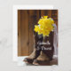 Customise these rustic chic Yellow Daffodils and Cowboy Boots Country Barn Wedding Flat Stationery Note Cards with your own personal message after your March, April or May marriage. These informal yet elegant custom ranch theme flat note cards feature a quaint floral photograph of brown leather western cowboy boots filled with yellow spring time narcissus flower blossoms and a bridal veil with a barn wood background on white satin.