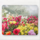 A beautiful field of dahlia blossoms in fuchsia, medium pink, white, peach and yellow set against a dreamy grey sky. Personalise with your name or message in dark grey script font.