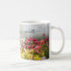 A beautiful field of dahlia blossoms in fuchsia, medium pink, white, peach and yellow set against a dreamy grey sky. Personalise with your name or message in dark grey script font.